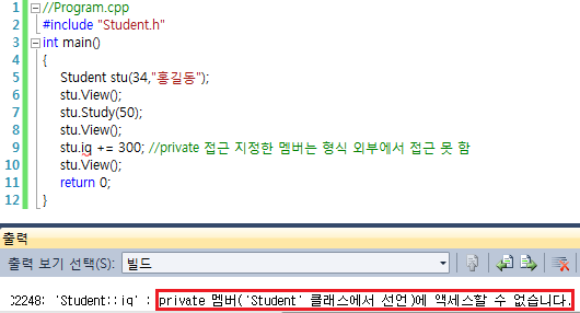 //stu.iq += 300; //private 접근 지정한 멤버는 형식 외부에서 접근 못 함