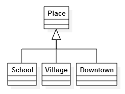 그리고 학교, 주거지, 다운타운이 있죠. 그런데 이 세 개의 형식은 학생이 올 수 있고 초점을 받아 사용자와 상호작용을 수행하는 등의 공통점이 있습니다. 논리적으로 보았을 때도 “학교, 주거지, 다운타운은 장소이다.”로 표현할 수가 있으니 일반화 관계로 표현합시다.