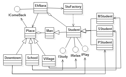 이 외에 Man, IStudy, IRelax, IPlay를 추가하세요. 그리고 이를 기반으로 Student 클래스를 추가하세요. 그리고 Student 클래스를 기반으로 MStudent, SStudent, PStudent 클래스를 추가하세요. StuFactory 클래스와 IComeBack도 추가하세요. 그리고 IComeBack을 기반으로 파생 형식으로 EhNara를 변경하세요.