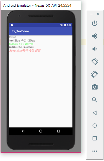 text 속성은 화면에 표시할 내용입니다. textSize, textStyle 등의 속성을 제공하고 있습니다.