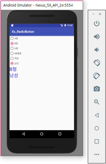 혈액형을 선택하기 위한 RadioGroup을 참조하는 rg_blood의 체크 상태 변경 리스너를 등록합니다. 리스너에서는 먼저 혈액형을 표시할 TextView를 참조하기 위해 findViewById 메서드를 호출합니다. 그리고 리스너의 입력인자로 전달받은 checkedId값이 어느 RadioButton의 ID인지에 따라 TextView의 text 속성을 설정합니다.