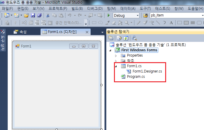 그리고 Form1.cs는 개발자가 작성할 부분이며 Form1.Designer.cs는 통합 개발 환경의 디자인 창에서 자식 컨트롤 배치나 속성 지정 및 이벤트 핸들러를 추가한 부분의 코드를 마법사에 의해 작성해 주는 부분입니다. 마찬가지로 개발자는 Form1.Designer.cs 부분을 수정할 필요는 거의 없습니다.
