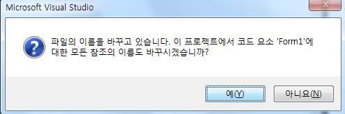 Windows Form 프로젝트를 생성할 때 만들어진 메인 폼의 이름이 Form1인데 이를 자신이 원하는 이름으로 변경하세요.